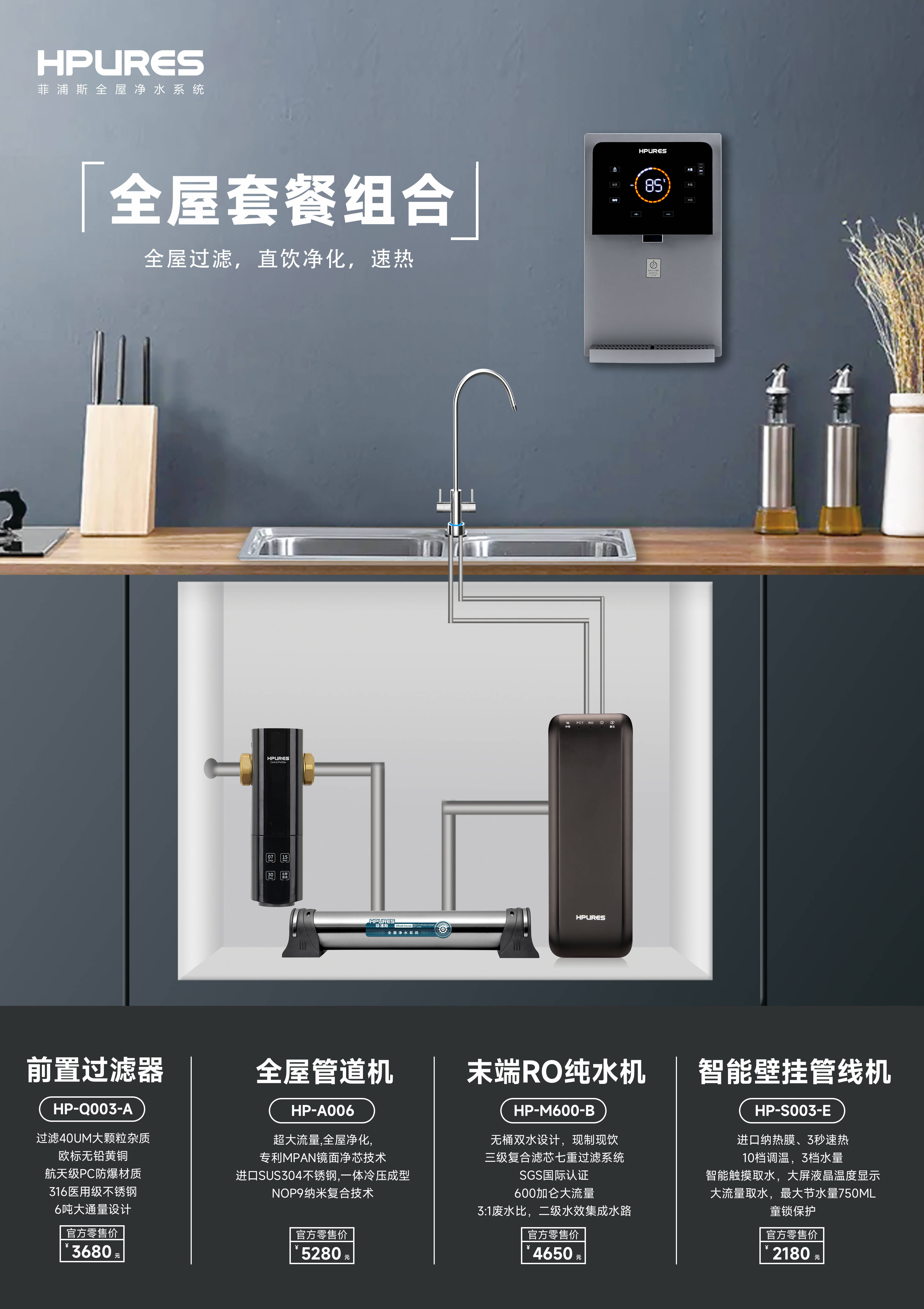 产品特点:涵盖家用和商用净水设备,包括净水器、软水机、管线机等。