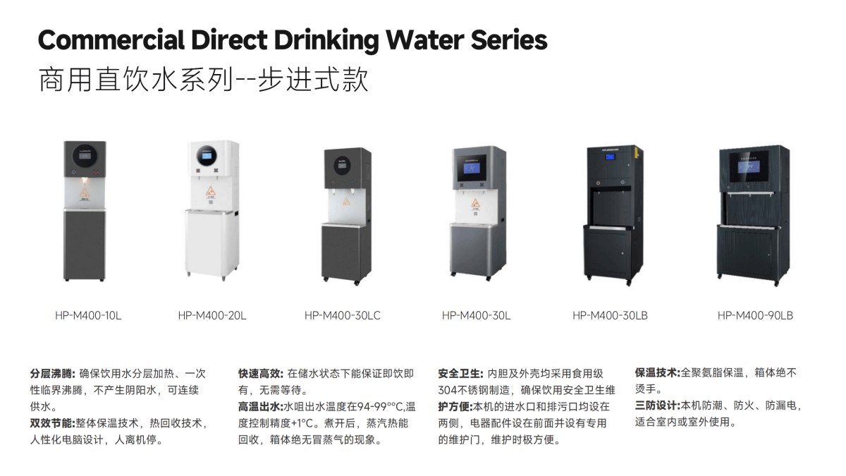 产品特点:提供全屋净水系统,包括前置过滤器、中央净/软水机、末端净水器、即热管线机等,商用产品适用于学校、企事业单位等。